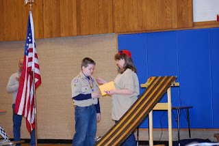 And here he is, receiving his 1st place medal. He and Sis. Pierce go back a long ways. She was his Sunbeam Primary teacher. I remember in the grocery store one afternoon with tears in her eyes she told me about how sweet he was in class, and made me tear up too. That doesn't happen to me a lot in the grocery store, so I remember that day well. She was his teacher again as a five year old which surprised me. Not often do you have the same teacher for a whole year twice, but I already knew how much she loved my boy, so thankfully I watched him go happily to her class and continue to learn. When he was 8 she became his Primary President. She motivated him to learn all his Articles of Faith and he knew that she loved him even when she told him to go back home and try it again next week. She was just released from that calling in December and is now his Cubmaster, and again, part of one of the special memories he'll have of his childhood. I thank the Lord for people who give so much of themselves to bless the lives of others, and especially those who help me raise my children.