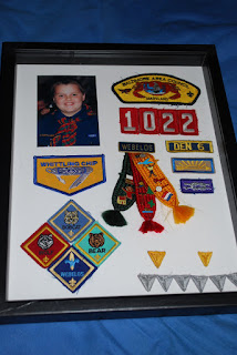 The last week ever as a Cub Scout and it's the Pinewood Derby. Last week I put together this shadow box for him to remember his Cub Scouting days. His dad was dreading this event. This is our sixth one. We never do very well. MyMike was hoping they would drop it this year, but they didn't. I reminded him it was his last year ever, then retirement from all Cub duties. So, he and his boy went to work, with the boy's design and his dad's skill with the saw and the drill. They sanded and shaped it together, primed and painted, while munching on treats. . . good bonding time going on down in the basement. I think big brother came down too to help with the work. One morning I came downstairs to find MyMike on the internet looking up tips and suggestions on pinewood derby cars . . . a first. So, last night was the big race. In his shyness and anxiety, MyMike didn't really want to go, but of course, he HAD TO GO, and he got a good seat so he could watch his boy and their car. My boy was pretty calm. He didn't expect much, but there is always hope. For him, part of the joy is just being with his buddies and having a little friendly competiton, though my boy is really not very competitive.