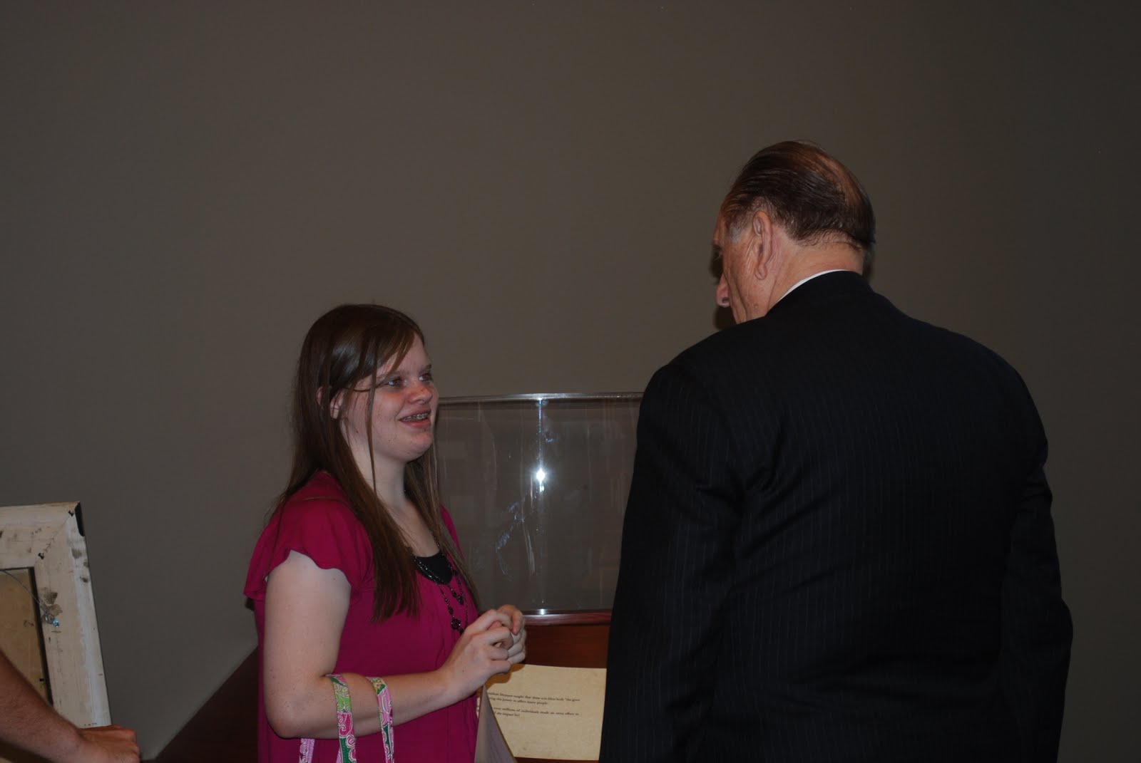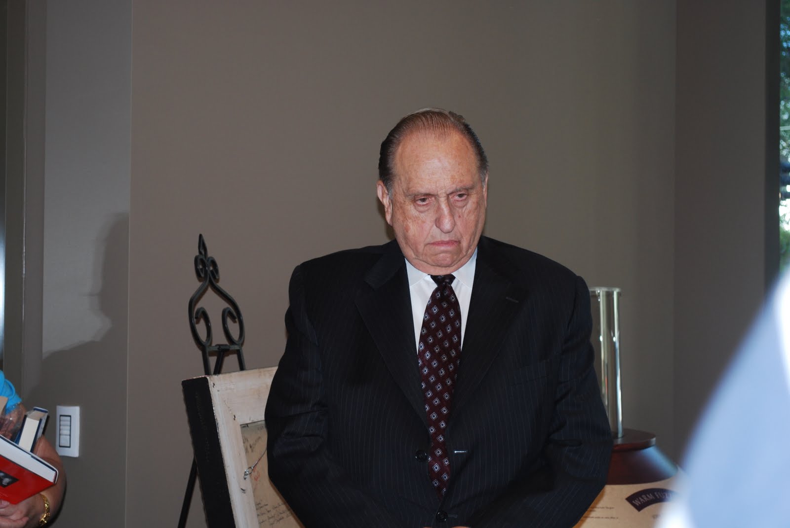 (Taking a picture of him when he's listening and not looking directly at me!) Yes, it was President Monson, who happened to visit Deseret Book at the same time we did. Touring the display to promote his new autobiography, we shook his hand, got to speak with him and heard him comment on the DVD of his life. We ended up spending more than hour with him, just feet away from him most of the time - WHAT AN AMAZING EXPERIENCE!!!