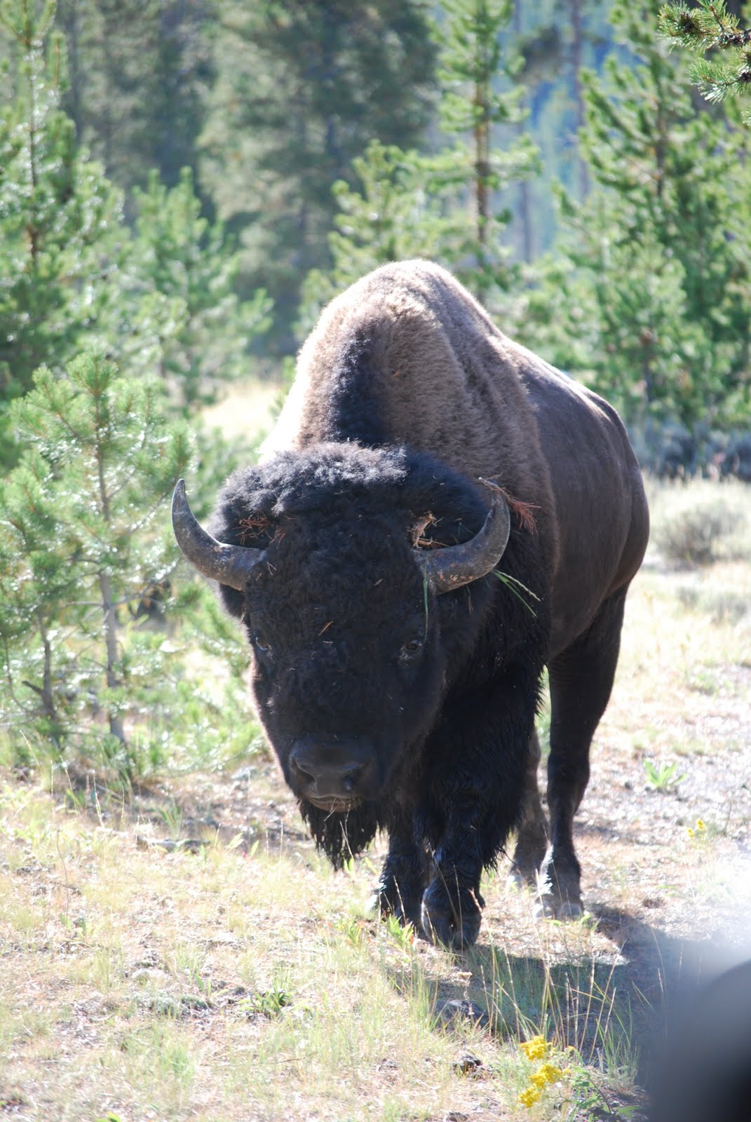 Mr. Bison who suddenly appeared when a truck took a right turn on the main road in front of us in Yellowstone National Park. He surprised us being just on the other side where the truck was. He was literally as big as our car. Later in the week I had buffalo with mushrooms and onions for dinner at Maddox - leaner than regular beef, but quite tasty.