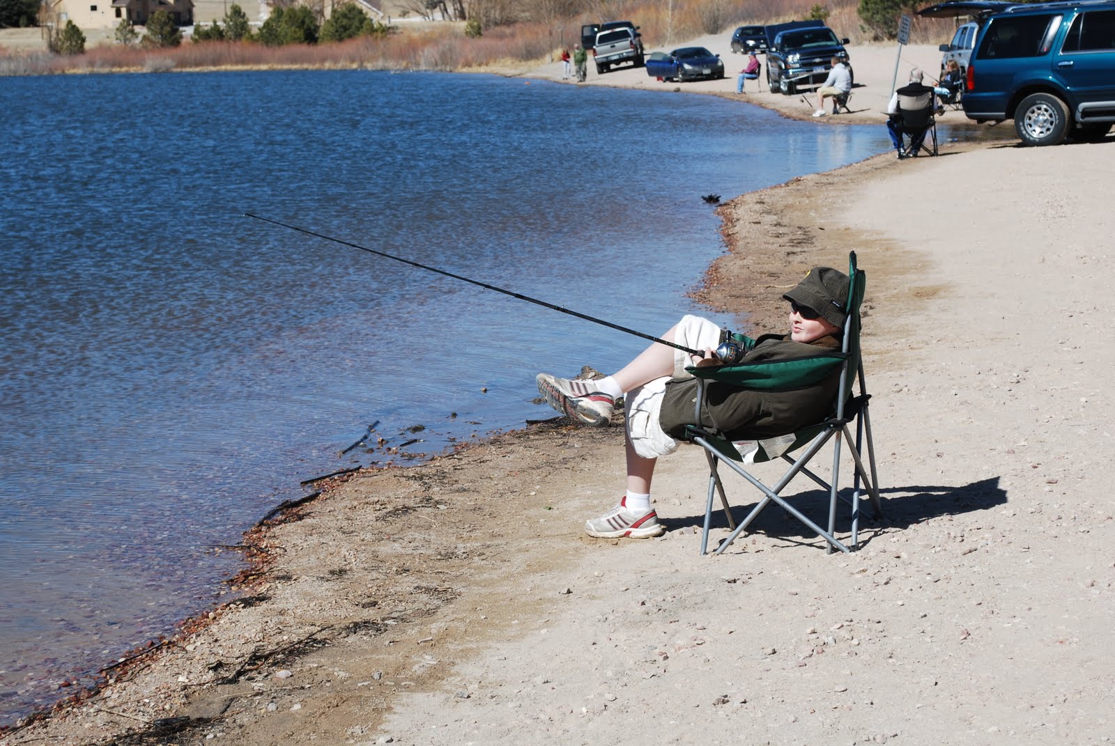 Last week after hiking around Garden of the Gods the kids were really excited to go fishing. The night before we had gotten licenses and the rods were loaded in the back of the car. We got there after lunch and as you can see, several other people had the same idea, but we found a spot just a little off the center of the lake, pulled the car right by the edge, and let them fish. My dad, who barely likes to fish, was a great grandpa, helping them get situated, though his line kept having problems. I think he only got to cast about three times. He is so patient!