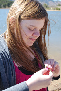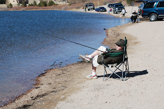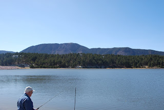 Last week after hiking around Garden of the Gods the kids were really excited to go fishing. The night before we had gotten licenses and the rods were loaded in the back of the car. We got there after lunch and as you can see, several other people had the same idea, but we found a spot just a little off the center of the lake, pulled the car right by the edge, and let them fish. My dad, who barely likes to fish, was a great grandpa, helping them get situated, though his line kept having problems. I think he only got to cast about three times. He is so patient!