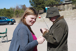 One of my least favorite parts of fishing is hooking the bait on, especially worms. In fact, I don't do it. Its the duty of a fisherman/woman to load their own hook. Here my girl isn't too excited about it, as her brother wholeheartedly embraces the opportunity. . .