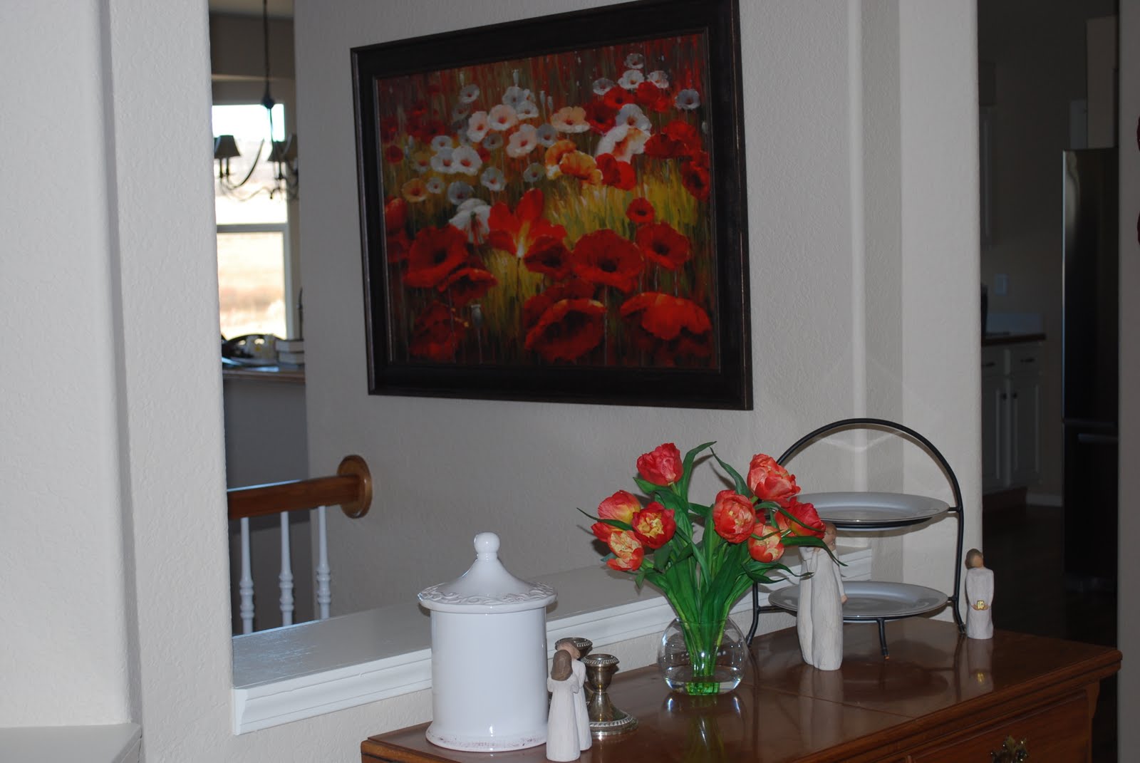 So I moved the great room rug to the dining room rug and its perfect for that room, not competing with the rug in front of the front door. Then I moved the poppies closer to the poppy picture, and now the dining room table feels better with the apples back on it.