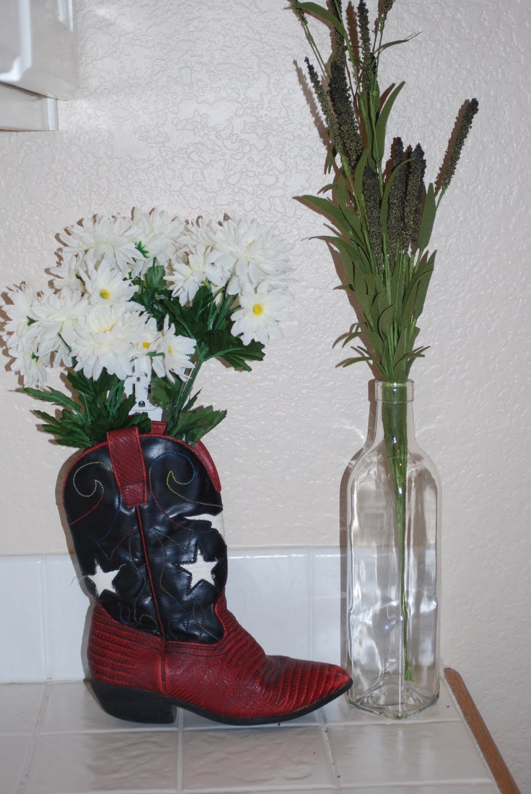 These are the plants on the side table. I just got the flowers for them yesterday so I haven't even brought them downstairs yet. MyGirl is doing that as we speak. Anyhow, a little greenery is needed down there, and I love Cowgirl's first boot from when she was five years old. I only have this one, and thought it was a good use for it. Can't wait until Cowgirl can come and see it in person.