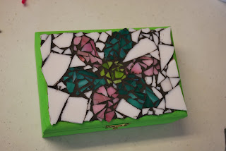 MyGirl and I made this mosaic box at the craft cabin. Actually I just laid down the glue. She did the hard work.