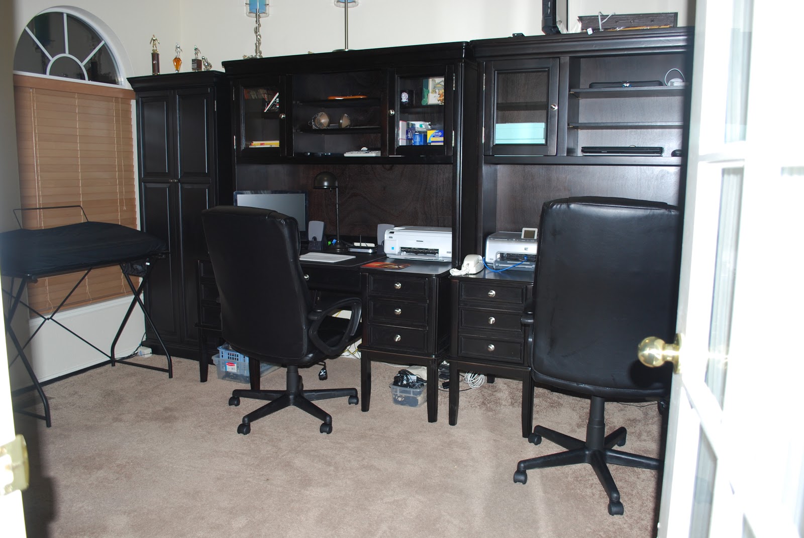 All along, I wanted white desks and cabinets, but the selection around here was minimal or chintzy. So, after deciding not to have a custom-made white office, we opted for readily available black one. Don't ask me why I didn't want traditional wood. I don't know why. I guess I just wanted it to feel a little more modern. So, we got two desks and hutches that are identical and put them side by side. You can see the laptops on the right hutch shelf. That's the kids' desk. Someday it will be mine. MyMike's desk is on the left. Now his keyboard is not blocking the door, and his new cabinet houses all the equipment that used to sit on top of the roll top desk. We aren't finished, so please ignore the things on top of the hutch and below the desk. I still want to find baskets for underneath the drawers of the desks to house those things, and a few other items that are convenient to an office. We need artwork back up to give it personality, but the bones are in place.