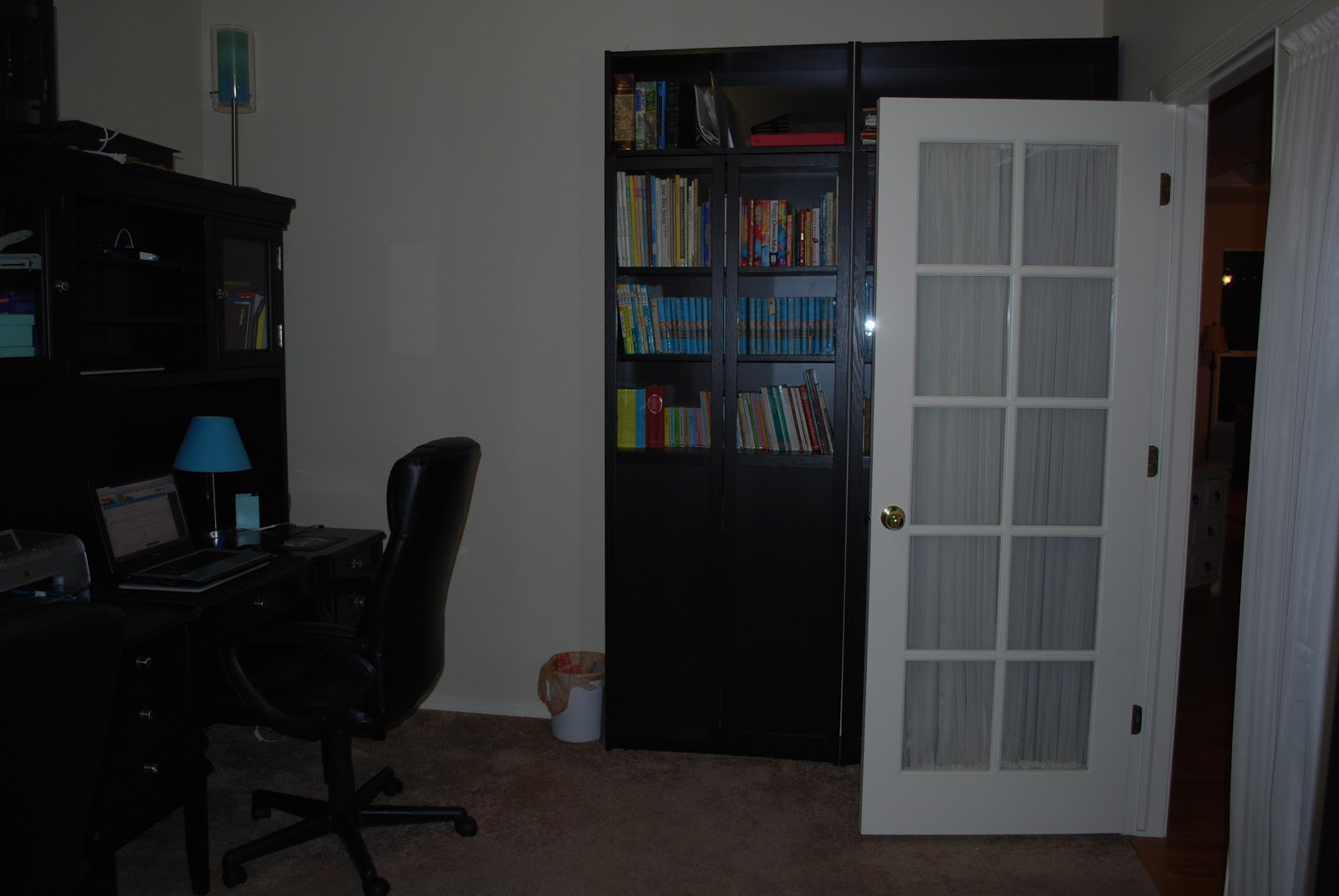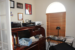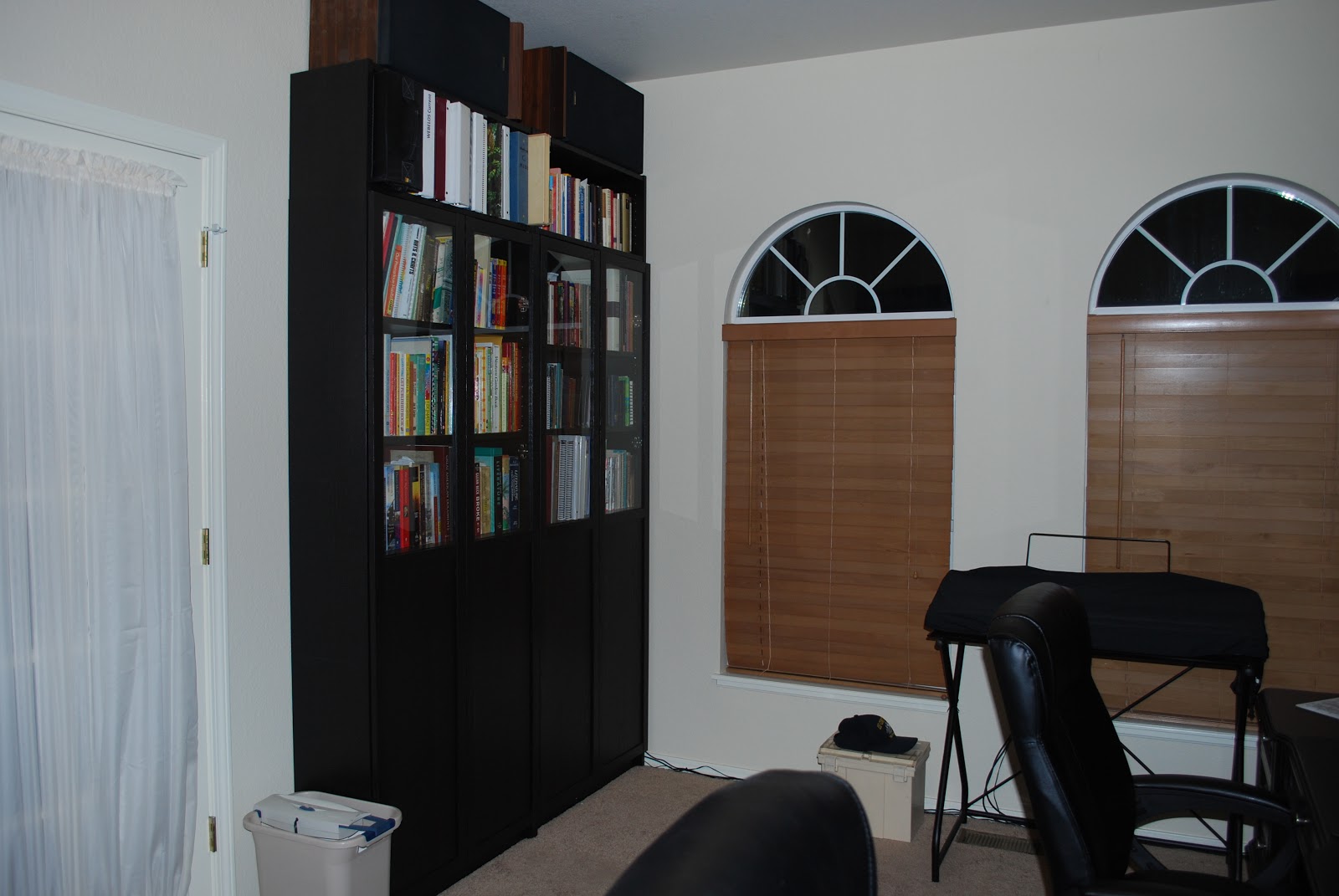 This was my office. Seriously. A pink chair which is 25 years old. I was ready to give it away before we moved, and no male member of the my family could part with it. Us girls? We were ready, but not the boys. So, this is where I have sat for the past couple of years with my laptop on my lap, blogging, reading emails, etc. Big ugly speakers myMike insists are necessary to listen to the music he composes and the mishmash of unmatching bookshelves, dressers converted into bookshelves, and ugly filing cabinets. . . . it wasn't pretty but it did function. Barely. There was another desk the kids used for their laptops, and everything was filed on top of the filing cabinets.
