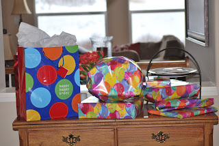 I decided to create a birthday banner that we can reuse from now on. I went with a bright color and polka dot theme. MyMike had the good idea to hang it at the top of the blinds in the dining room, perfect since we have birthday dinners at the dining room table. You can see the sun's setting as we are ready to sit down.