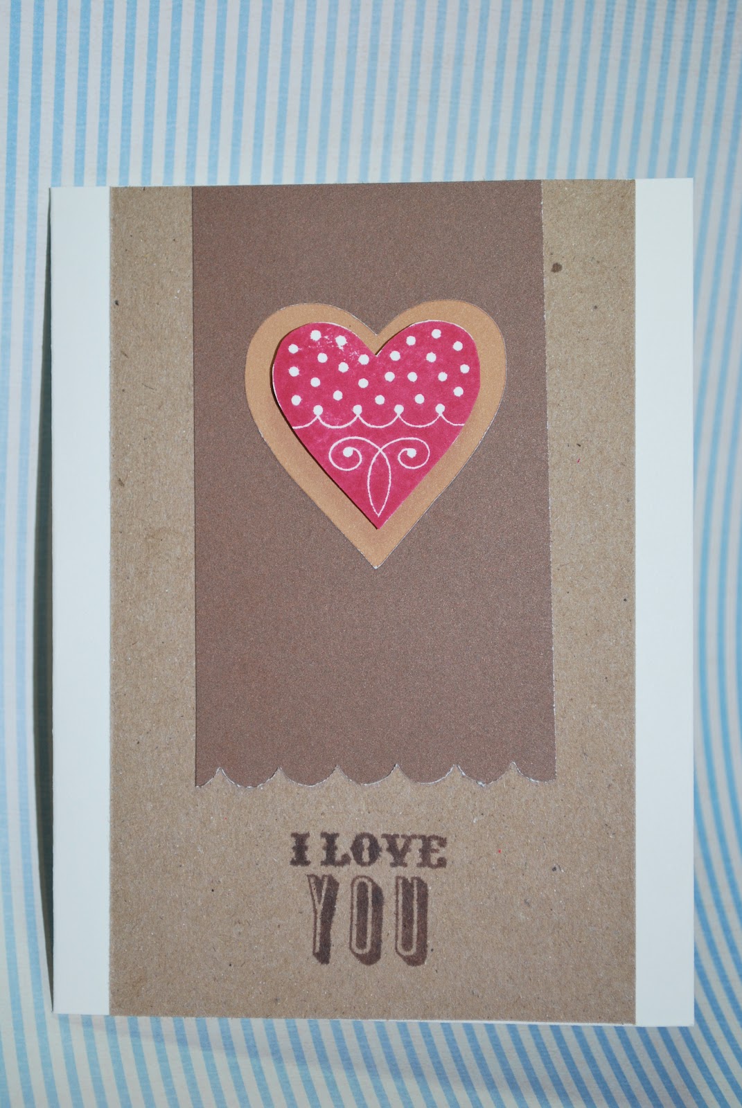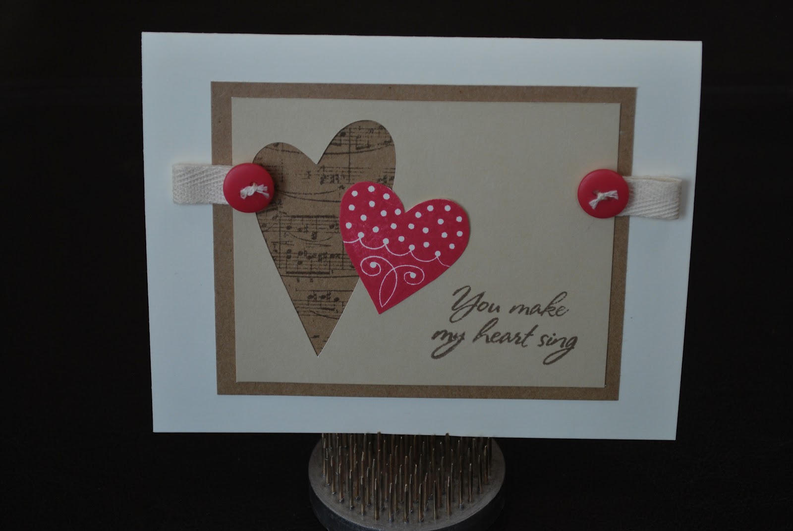 Used the Cricut to cut out the heart background shape on the Bamboo colored cardstock, and also to cut out the white heart shape which I later stamped in Tulip for the polka dot heart. I also stamped the musical background onto the Desert Sand cardstock giving it the layering I wanted. . . . for my musical hubby. He liked it!