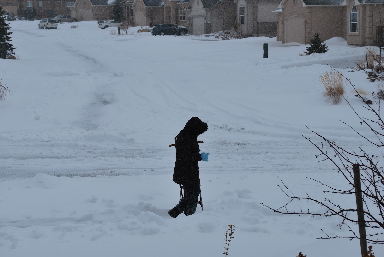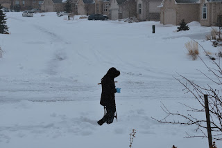 The past couple of weeks we've had true winter weather, with sunny blue sky days in between. MyGirl loves this snow in all its forms and is so excited to be out in it, whether its shoveling or playing or just driving by. Here she is with Grandpa's sled walking down the street to take advantage of the school's hill.
