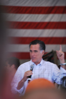 I went to my first presidential pep rally today. It was about as I expected. We stood (about in the very middle) and waited a half hour before Mitt Romney made his appearance. This was my best photo of the day. That's one of his Secret Service agents next to him. He came down to shake hands with the crowd after speaking to us for a little less than half an hour.