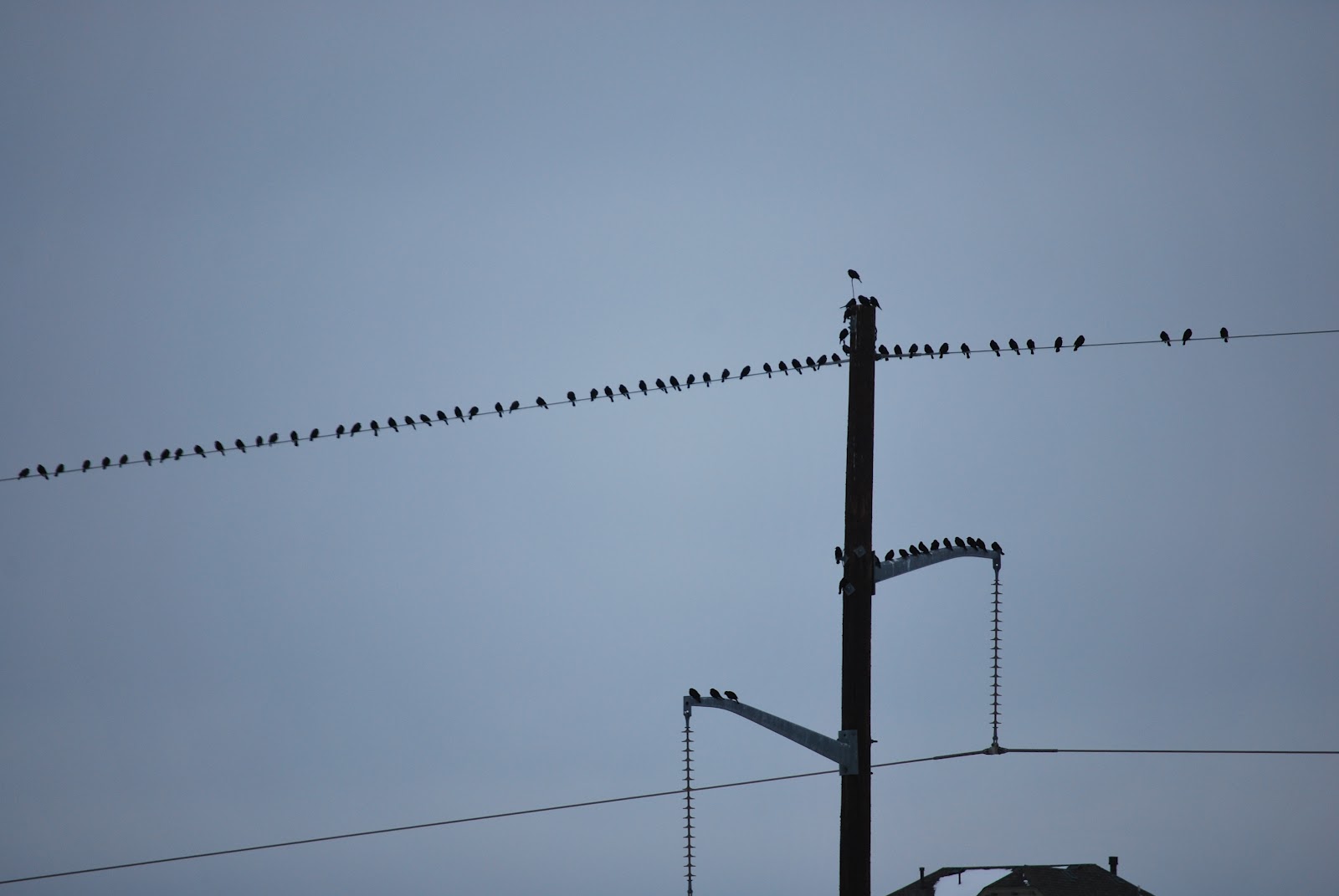 Another about-to-snow day, and I noticed the birds lining up on the power lines. Whenever nature makes lines or distinct shapes, I'm fascinated. I honestly think that was my favorite part of Finding Nemo, when the school of fish shape change.