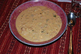 In stock pot, cook onion in butter and olive oil. Add flour and whisk until mixed well. Then add liquids. Bring to a boil and simmer until thickened. Turn to low. Stir in seasoning. Add beans, chilies, chicken, and cheese. Cook for 15 minutes. Add tortillas and cilantro and cook for another 5 minutes. Serve to rave reviews! My Mike loved this!!! We all did. Serves 5.