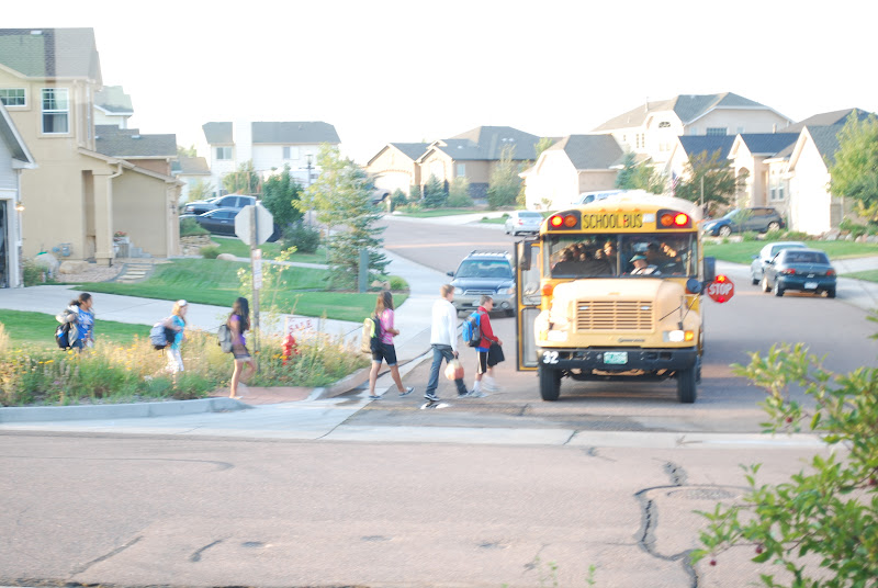 Seven at the bus stop this year. We have the option of paying for the bus in our district now, either per ride or a yearly pass or driving to school. I opted for the yearly pass. Since the bus comes at 7:04, its a good time for me to exercise before getting my girl up at 8 to start the homeschooling day. Some days that's going better than others, both in regards to exercising and homeschooling, but Algebra Test 8 is ready to be sent out tomorrow. Hurrah! We've been working on it off and on all summer. Only three more Algebra tests to go. It will be a happy day for both of us when its done!