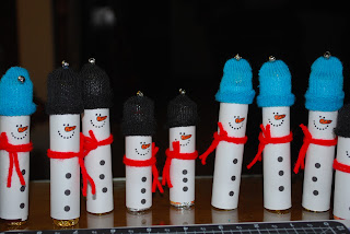 I made these last weekend. A Close To My Heart Consultant, Caron Barnard, gets credit for coming up with this cute idea. The tall ones are made with Rolo candies and the small ones with Lifesavers. Their darling hats are the cut off fingers from Dollar Store mittens. My mom gave me tiny jingle bells I glued on top and I used a rubber stamp from CTMH for their faces, just coloring in their carrot noses. I tied two pieces of bright red yarn for their scarves, and three black ink dots for their buttons. I just thought they were so cute and easy. I'll be handing these out to the children in my neighborhood, and the ones in my new calling.
