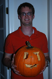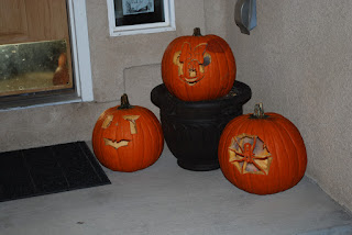 Why did we pick Saturday? Because we were all home, we had time, and the pumpkins had been sitting around for almost a month, begging to be carved. Unfortunately, Minnie started to develop "cancer," and was rotting, and one of the spider's legs was withering and he was starting to mold inside.