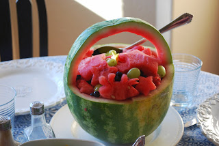 I taught the boys how to play tennis and they've really enjoyed it. They played three times a week at first, but with Littlebuddy being in Philmont now and BigBuddy working two jobs these days, they just haven't gotten onto the courts at our local high school since Wimbledon. It made it more fun to watch one of the men's matches, however. They now understand the scoring, the difficulty it is to make 90+mph serves and why this game takes lots of practice to excel.I forgot to show this fun dessert we had for the 4th. I found waffle bowls at our grocery store, dipped them in chocolate and patriotic sprinkles. Then we filled the waffle bowls with the best vanilla ice cream, chocolate covered blueberries and strawberries. We added a flag, then Steven included Ryan's flag, his napkin ring, stamped with "God Bless America," and a sugar cookie, also covered in patriotic sprinkles. MyGirl and I like to have fun sometimes when we're hosting a holiday meal. Mom and Dad came over. Dad brought salmon from his smoker and Mom cut up a fabulously sweet watermelon and we roasted hotdogs and made side dishes and it was all good. I think my favorite was the fresh corn on the cob and the watermelon. That says summer to me.