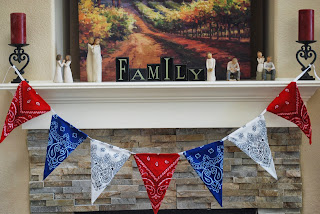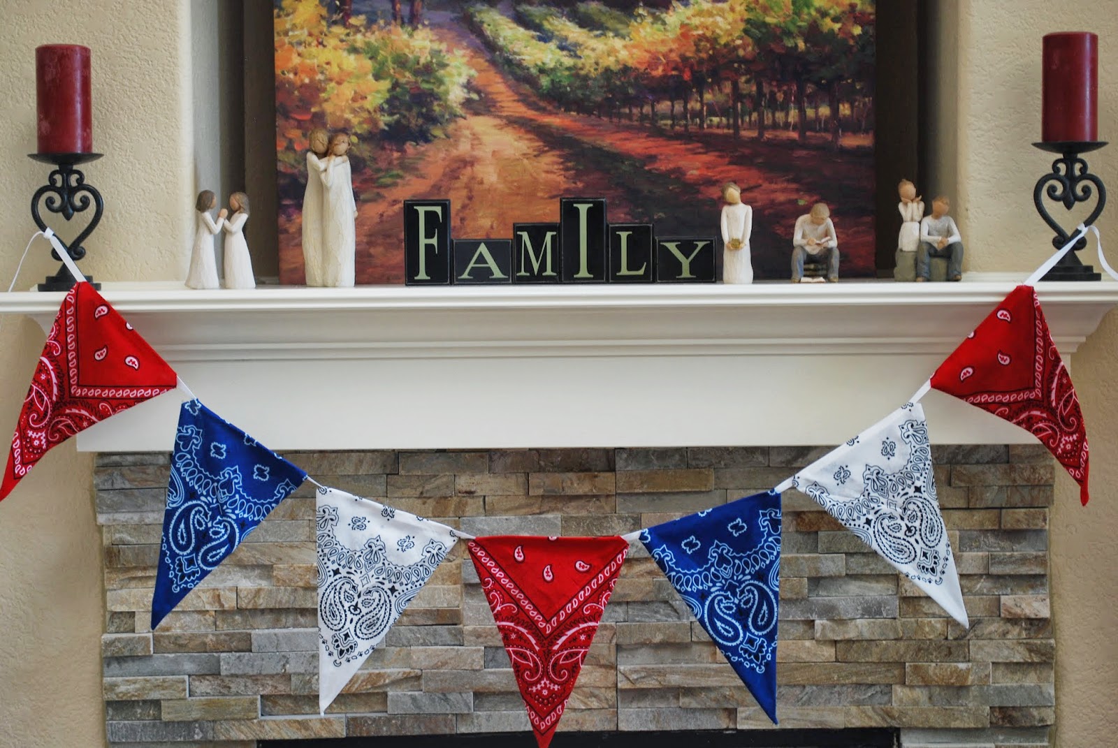 I got home in time for the 4th of July. For some reason, no one wanted to go to the parade this year, and Big Buddy was working for part of it, so we just hung out at home. I shortened the bandana banner and like it better hanging from the mantle here. I got to use my patriotic quilted table runner, but then it got wax on it and now its wrecked. . . that's life sometimes, sadly. Still looking for the best way to get rid of melted candle wax.