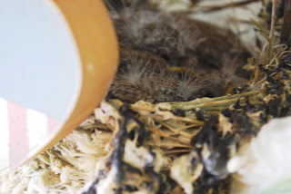 Its very hard for me to get a good photo, but those furry grey/tan blobs are the babies sleeping. The nest is getting kind of grody with the parents both leaving their droppings on the outside of the nest but we still get very excited when we hear the squawking and sometimes see little beaks reaching up for their next meal. This is the size of the babies after nine days. I don't know how long they'll be there, but they've become our babies too, and we're careful about making sure the front door doesn't get slammed when anyone goes in or out.