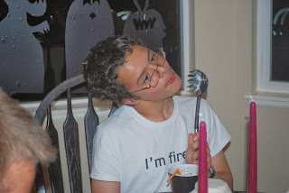 Did I mention they also had crazy utensils. Here one of the boys eats his Silent Screamers (mashed potatoes) with a spaghetti spoon.