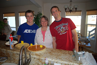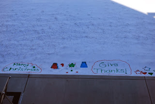 In the recent snow storm that we had she used one of last year's Christmas gifts, snow paint, to add designs and messages to the back yard. They're getting a little blurry now, but over a week later, they're still there. We're expecting snow again tomorrow night, so they'll probably only be here another day.Here was Thanksgiving at my mom and dad's house. Of course, I don't remember to take photos until after the meal was over, but I think my dad has a couple of all of us around the table. Here my boys are ready to eat some of the three pies we had - chocolate cream, apple in a brown bag, and pumpkin.