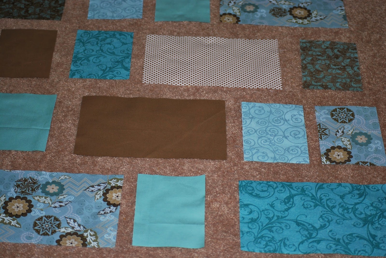 You probably know by now that I love Pinterest. . . . and yesterday I learned that today was National Quilt Day. Hmmmm, it just seemed wrong that I would completely ignore it. Since I cut everything I needed to make a quilt for MyGirl's birthday coming up in about six weeks yesterday, today I planned the fabric layout. Here is a little sneak peak. MyGirl picked out this layout idea from looking at my Quilting board on Pinterest, but since I couldn't find the directions I created my own based loosely on what I saw, and here we go. . . . its exciting to have another one ready to piece! And thank goodness she didn't have her heart set on a compass quilt! That would have been trouble. Fortunately, she wanted a modern quilt in blues and browns to match her bedspread and long enough to cover her when she wants to cuddle with it on the sofa. I've designed it to be 56 x 70. It will be my largest quilt yet. . . . Fun just waiting to begin. . . .