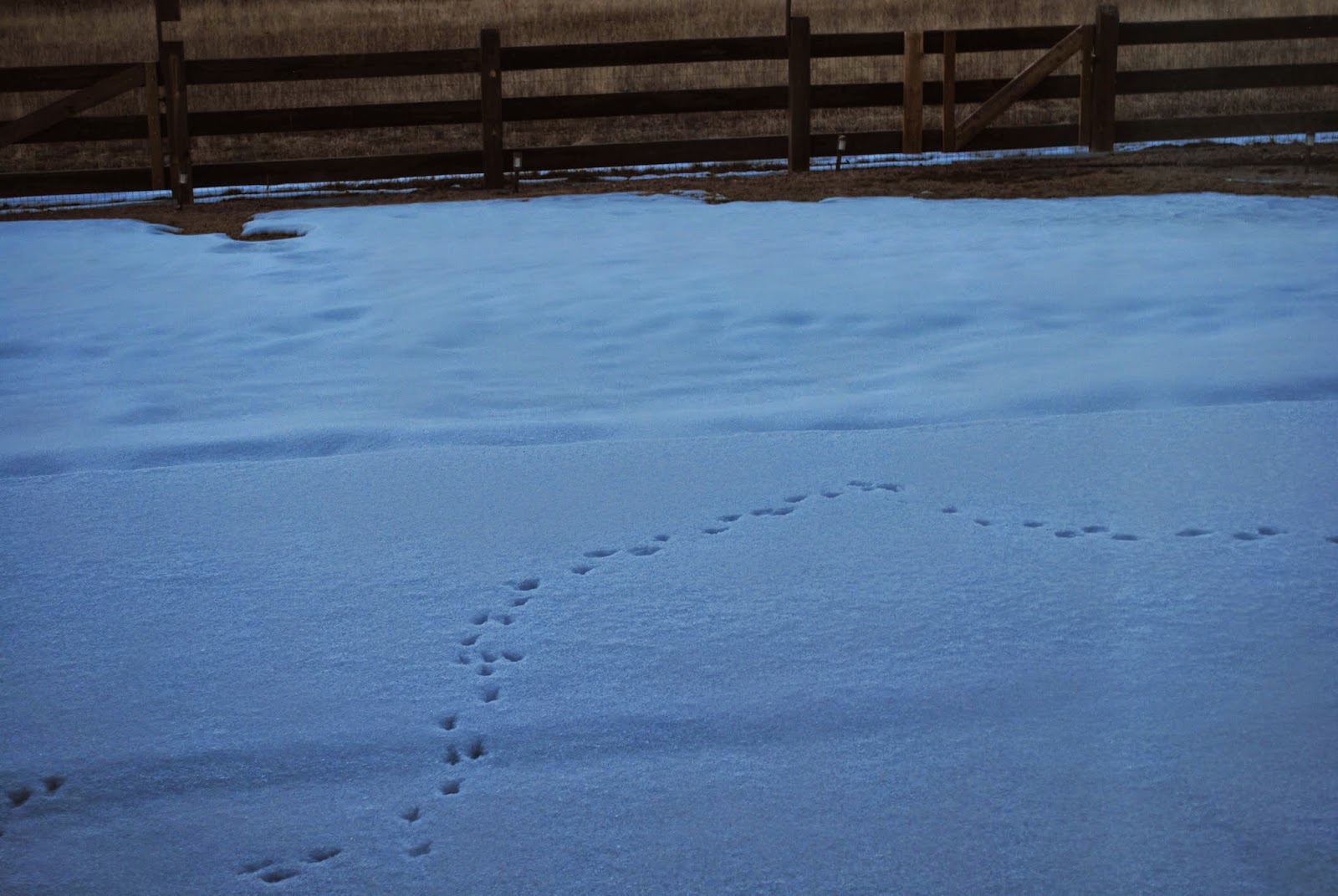 We had an 8 inch snow storm while he was gone. Our second biggest snowfall since we moved into this house 4 years ago this week but here it is a week later almost 70 degrees, so only this little bit on the north side of the house remains. I love the animal prints on the snow. The abundance of nature is one of the best parts of living in Colorado.