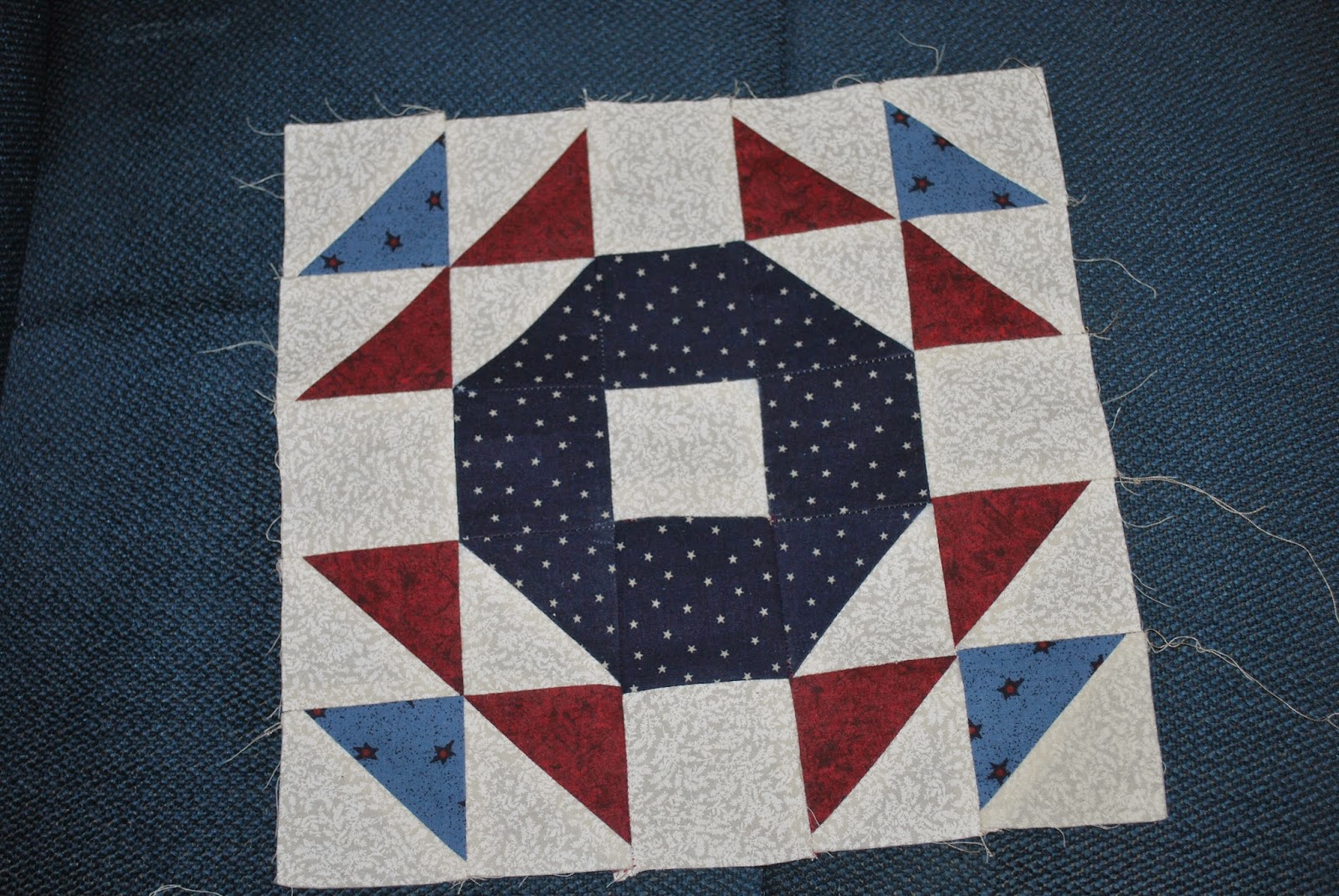 This was from the original sampler quilt I was going to make, then turned 15 of the squares into 5 table runners. I pulled this one out the other day as I was reorganizing my fabrics that were in bags and I'm thinking of turning it into a small wall hanging. What do you think? I'll have to add borders and perhaps something else in the row above and below. . . still thinking about that.