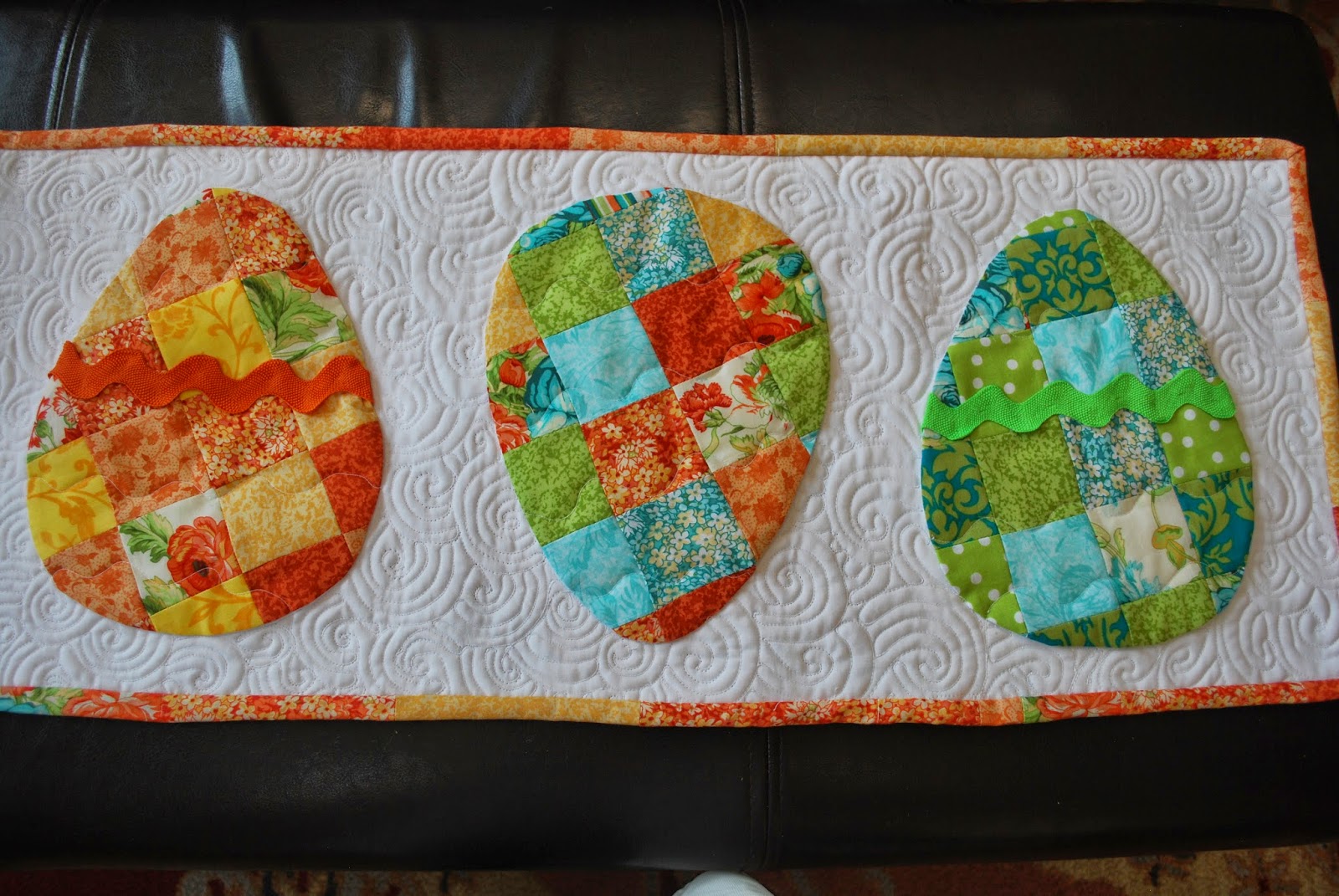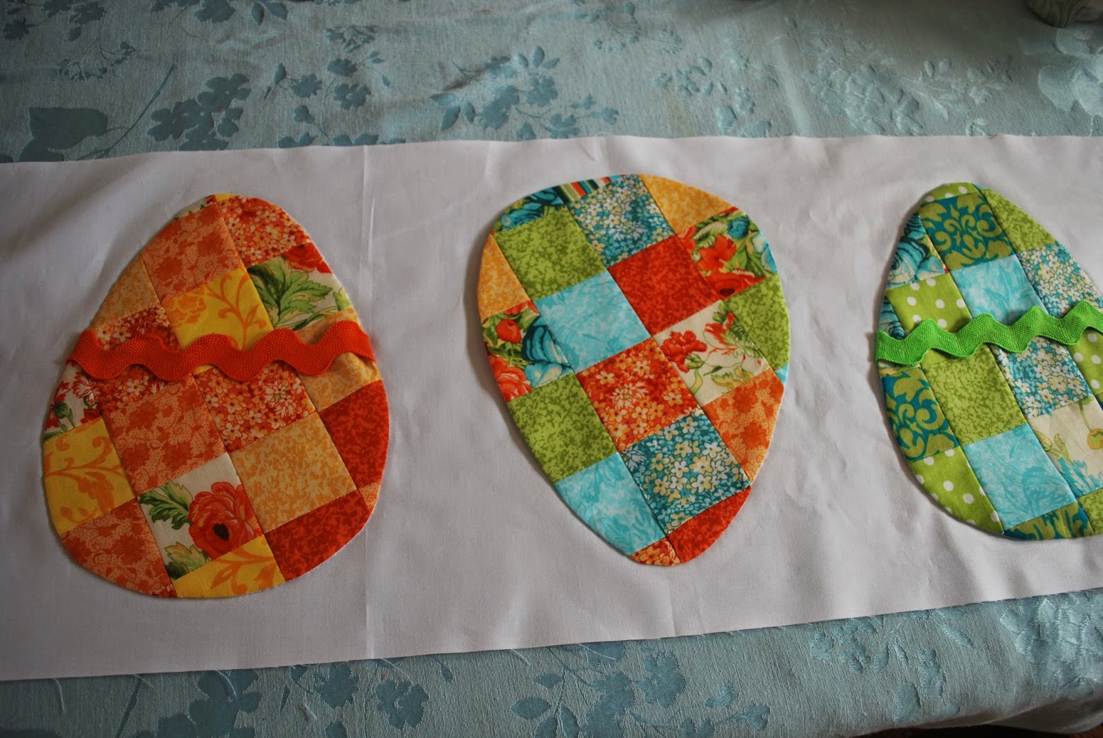 This is similar to a pattern I saw on Pinterest made by Shabby Fabrics. I credit them completely with the idea of taking scraps and making eggs although my pattern, the number and size of the eggs, and quilting is completely different from the photo I saw.