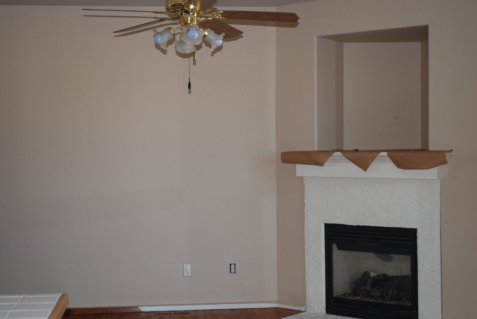 This color is actually called Knot, by Kwal Howell. It is just like Toasted Cashew. I thought there would be a contrast, but there isn't really, and its okay. We'll be using Rafia Cream by Behr to offer contrast in the rest of the upstairs, but what you're seeing is Knot. The light diffuses it because the right side of this room is all picture windows, but it looks like it matches the dining room. However, this room doesn't have crown molding, and I think it needs it, so add that to the list of projects for 2011. And, replacing the fan. And covering the spackle on the fireplace to stone. . . lots of projects ahead.