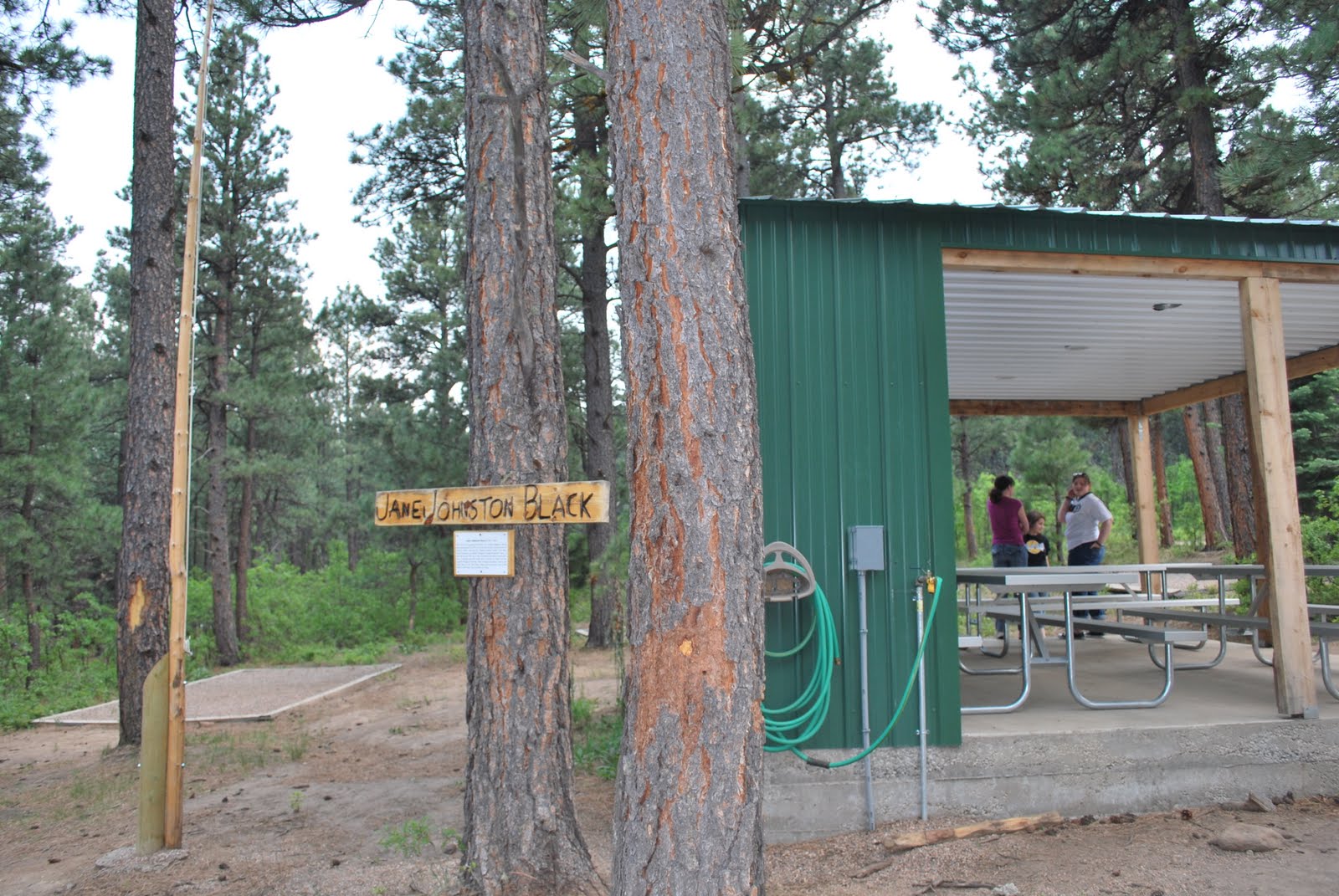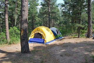 Well, I was quite surprised, first to realize that the last fifteen minutes were all dirt roads. Second, that each ward was pretty isolated from the other wards. Third, that this was all there was - four gravel tent pads, a small pavillion with a small storage closet for each ward, and a small cooking firepit, with a larger pavillion and bathrooms for the whole group. Where were the leaders going to stay? On the ground, next to the gravel pad in the larger 8-man tent. (Feeling very grateful this was not where I was going to be spending the night for the week.) This was REAL camping. Our ward was assigned the "Jane Johnson Black," site. A little biography of her life as a handcart pioneer quickly reaffirmed to me that this was going to be more sacrifice than the usual girls camp for Mygirl. She's always begging us to take her camping, so I truly hope she gets her fill this week!