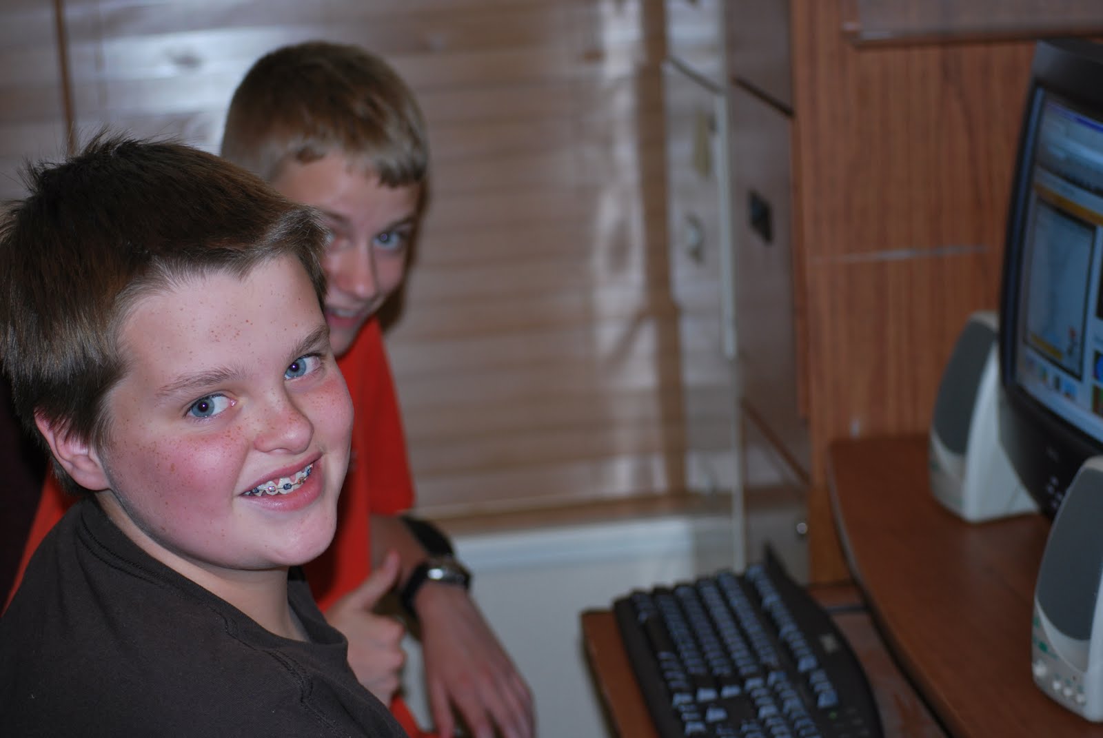 When they're not pretending they're cows, they busy on electronics. Just when they were set to go outside and physically play, a thunderstorm cropped up, so they came up in the den where I am and found some great YouTube videos to laugh at. 12 year old boys are in a class all by themselves. Silly, smart, goofy, embarrassing, obnoxious, and tender would be words I would use to describe them yet I am highly entertained just listening to them. What does that say about me? That one in front, I just adore him, so I guess it doesn't really matter how obnoxious he is. He'll only be twelve for another six months. He's growing WAY too fast!