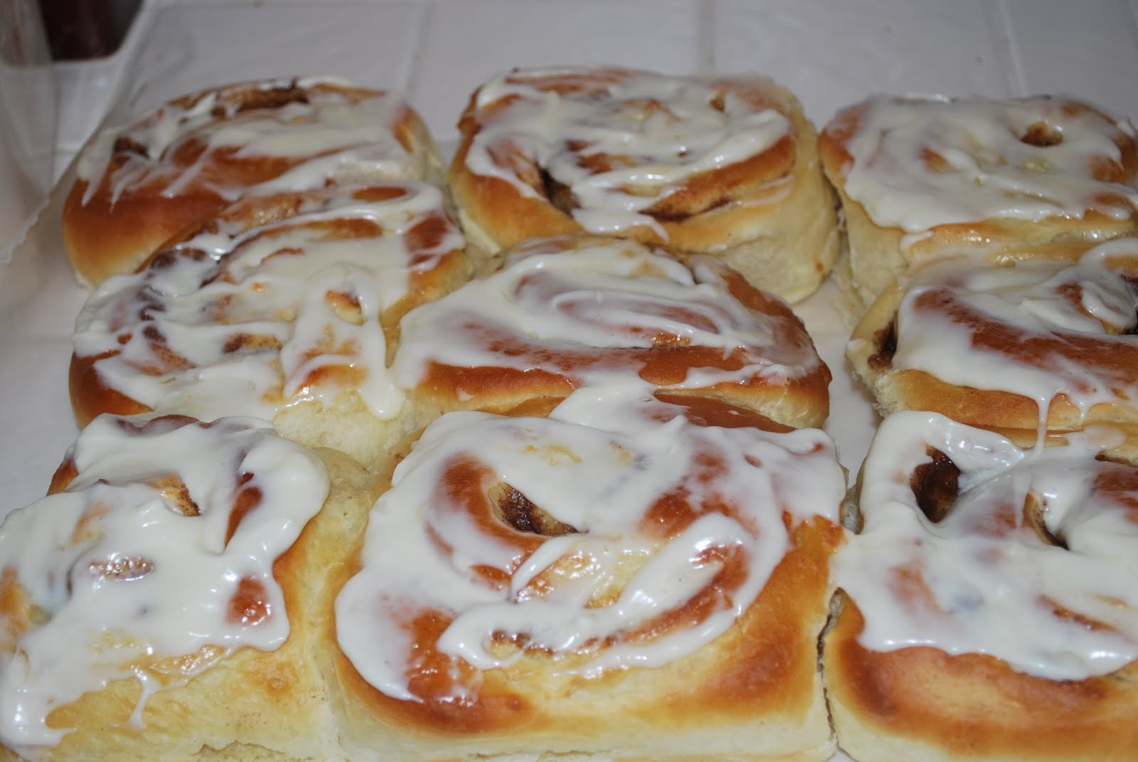 When dough fills the pan, bake in a 375 degree oven for 15 -20 minutes or until light brown. Carefully invert rolls onto the plastic wrap you used to cover them with shortly after they come out. then flip them upright again onto waxed paper. (She explained that this helps to keep the filling better inside the rolls.) Frost while warm. Immediately rinse the pan, as the filling with be hard and difficult to get off if you wait. It did rinse easily after about 5 minutes when I got to it.