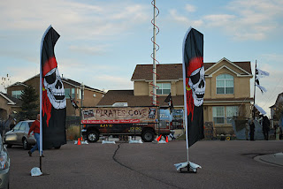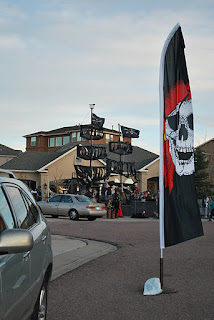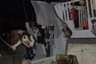 And the next morning, I only picked up seven little pieces of candy or trash from my yard, and three were candy I had given out, which I think got knocked out of their pillowcases as they turned down the driveway. I had bought 1000 pieces of candy. We started at 6:15 handing out and by 8:15 we had used up 800 pieces. The crowds were less solid at this point, every three or four minutes three or four children would come up our driveway. Before it had been non-stop. Think about it, in 120 minutes we gave away 800 pieces of candy - one per child. The last half hour, it was getting chilly, and I was tired, and so I gave out handfuls. I had one last bag left and I saved that for Mike and BigBuddy. They were happy. By 8:45 we were lights off in the house, and I got to see that Vocal Point moved on for another week. What a night! What a memory! We will never look at Halloween the same again. This is the street where Pirate magic happens!