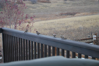 My neighbor with all the bird houses has put her house up for sale. Her husband has a new job in Phoenix. She will miss the birds and this weather, but three of her sons live in that area, so she knows it will be good. Fortunately for me, the birds often come visit my house too. I will have to start putting out bird food in my feeders, because I'll miss these guys. I spotted these four sitting on my deck railing over the weekend. They were there long enough for me to go to my room and get my camera and make it back to the kitchen. Then two flew away, and then one more, and then one was there by himself, quite content for a couple of minutes, then he flew off too.