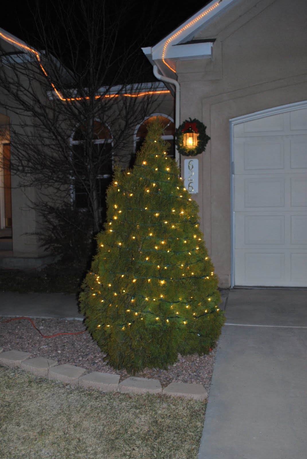 Black Friday last week turned into Light Friday for us. What started out as just buying a tree, became decorating the outside, which then turned into a very long experience in putting up outdoor lights. Two trips to the local Walmart later, and many, many trips up and down the ladder by MyMike, mission accomplished. When we first moved here, MyGirl declared that this tree would be the perfect tree to be lighted for Christmas, and I agreed. Now that we've done it, its my favorite outdoor decoration we've ever had because it twinkles :-)