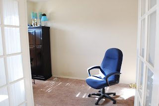This was my office. Seriously. A pink chair which is 25 years old. I was ready to give it away before we moved, and no male member of the my family could part with it. Us girls? We were ready, but not the boys. So, this is where I have sat for the past couple of years with my laptop on my lap, blogging, reading emails, etc. Big ugly speakers myMike insists are necessary to listen to the music he composes and the mishmash of unmatching bookshelves, dressers converted into bookshelves, and ugly filing cabinets. . . . it wasn't pretty but it did function. Barely. There was another desk the kids used for their laptops, and everything was filed on top of the filing cabinets.