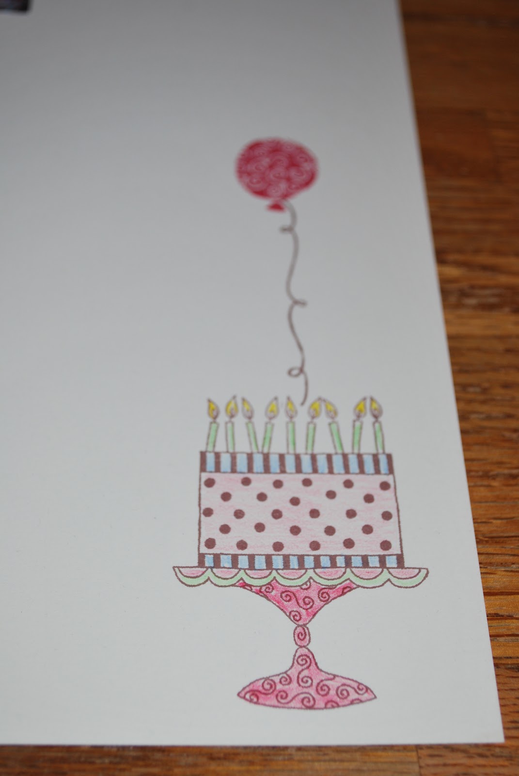 Here I stamped in chocolate ink then used colored pencils to fill in the cake with the colors that coordinate with the rest of the page. The balloon and string are also inked, the balloon using Tulip ink.