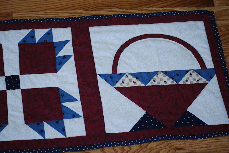 This really is the year I've become a quilter. After all these years, go figure. MyMike keeps saying, I thought you didn't like to sew. Well for the first forty-plus years of my life I didn't too much, but I find its like scrapbooking on steroids and I'm loving it. There is more fabric than colored paper and putting them together to create something useful makes me happy. I finished the second of five sampler table runners I'm making. I added a star binding to this one and liked that better than the original binding so I'll probably add it to all the rest. I still need to steam-iron it so it lays flat, then its all done. I really liked making the bear's paw pattern in the center. Curves are more challenging but I'm glad I learned how. I have three baby quilts I really want to make but I'm disciplining myself to finishing these first before I start on those. Most of these will go to my quilt guild's annual fund raiser in October. The baby quilts will go to my grandchildren . . . someday. As I started these blocks six years ago I thought I'd better get a start on things.