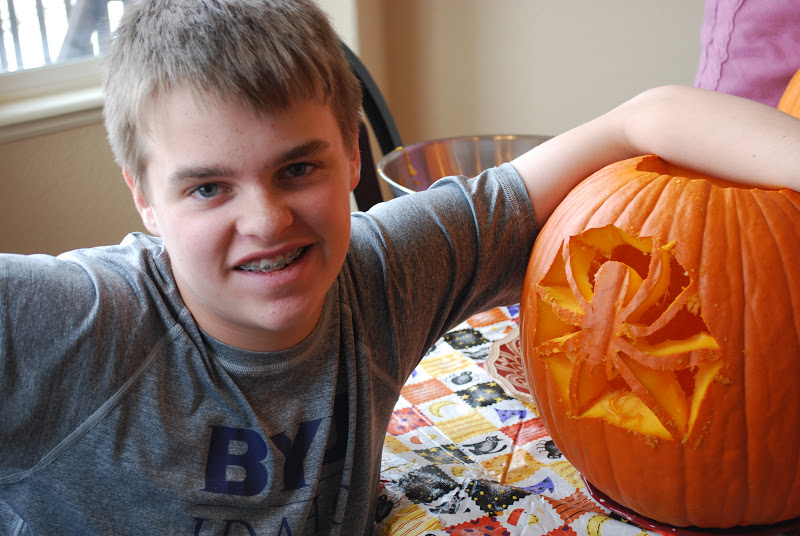 Finally, BigBuddy could leave the game long enough to come carve his pumpkin. I'll wait and show it to you on Halloween when its all lit up. He used only a pattern he himself created and it was very creative.