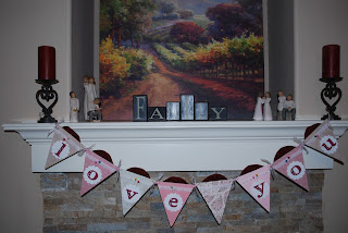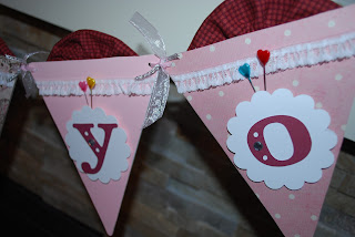 I used chipboard CTMH triangles for the base of each letter but any sturdy cardboard would work. The fabric was leftover from my Christmas quilt. I folded a 2 1/2" piece in half and gathered it, putting doublesided tape on the back to hold it in place, keeping the folded side up. I covered the cardboard in scraps of pink cardstock and patterned paper I had used in a YW bulletin board last year. Again I used double sided tape to adhere the lace, about an inch down from the top. The scallop and letters are both cut from the Art Philosophy Cricut cartridge. I added some clear sparkles to the center dot on the letters and some heart pins are sticking into the thick pop dots I used to raise up the scallops. I tied each piece together using pink organza ribbon and a thin silver Offray ribbon I had in my stash.