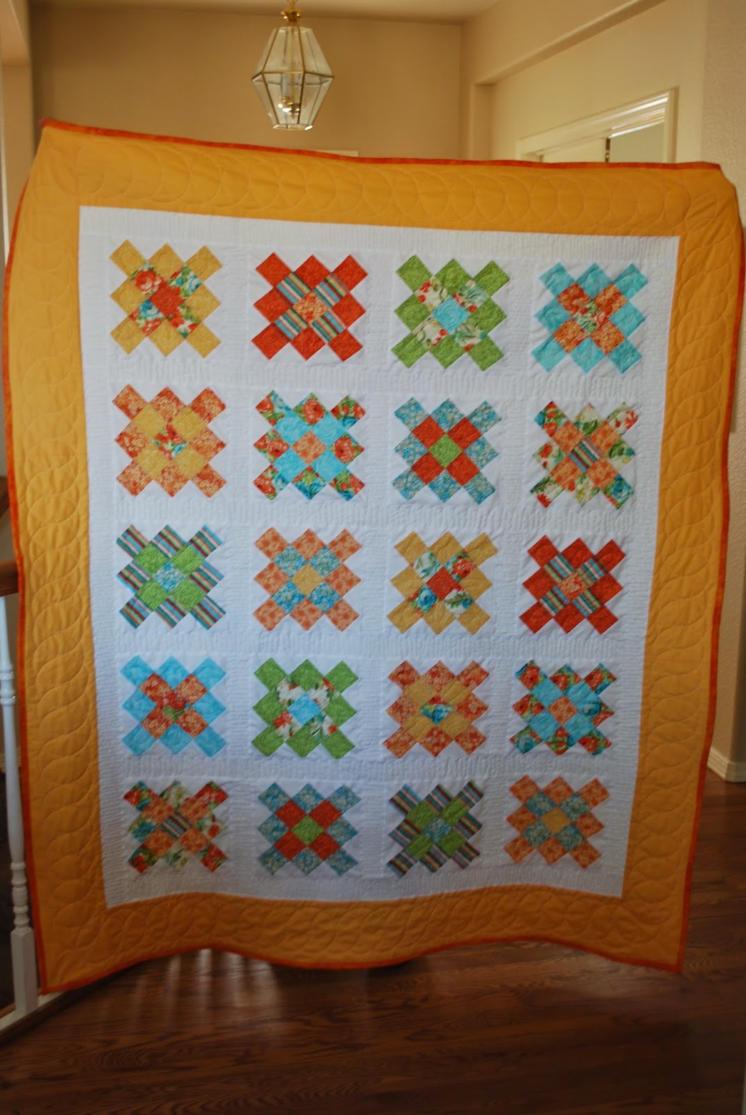 Do you remember this quilt I finished last January? It was too big for a baby quilt and I didn't really have anyone who needed a nice lap size quilt, so I hung it over my railing and have enjoyed its bright colors all Spring. My husband expressed the most interest in it.