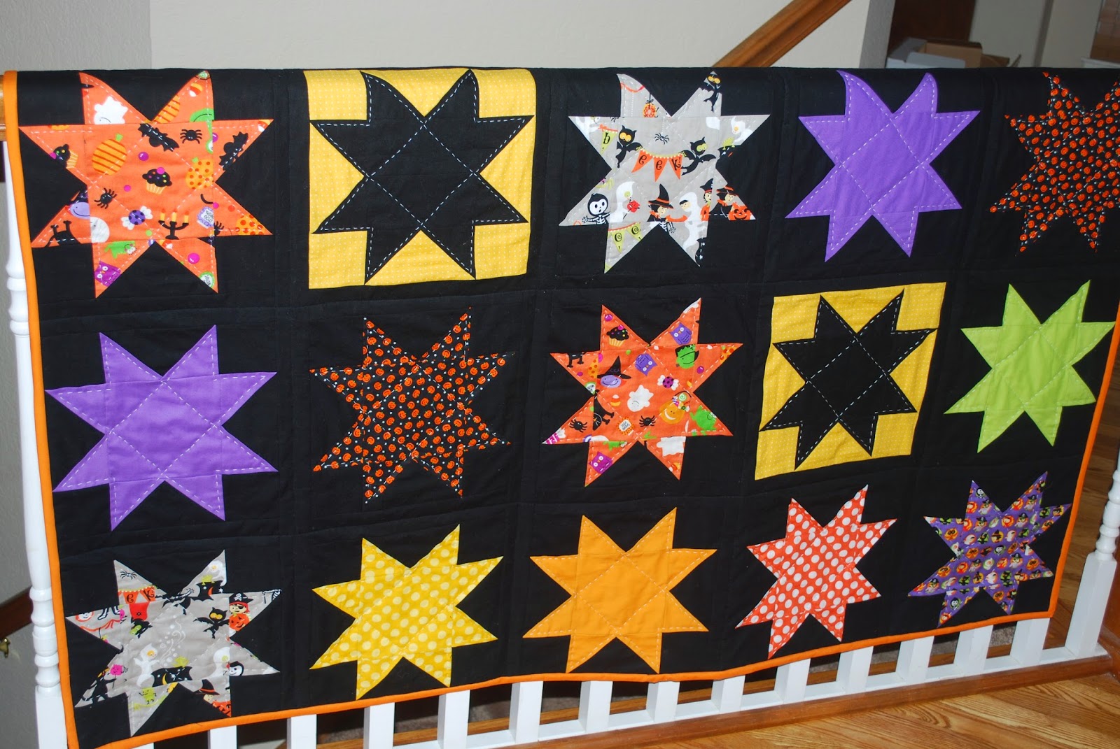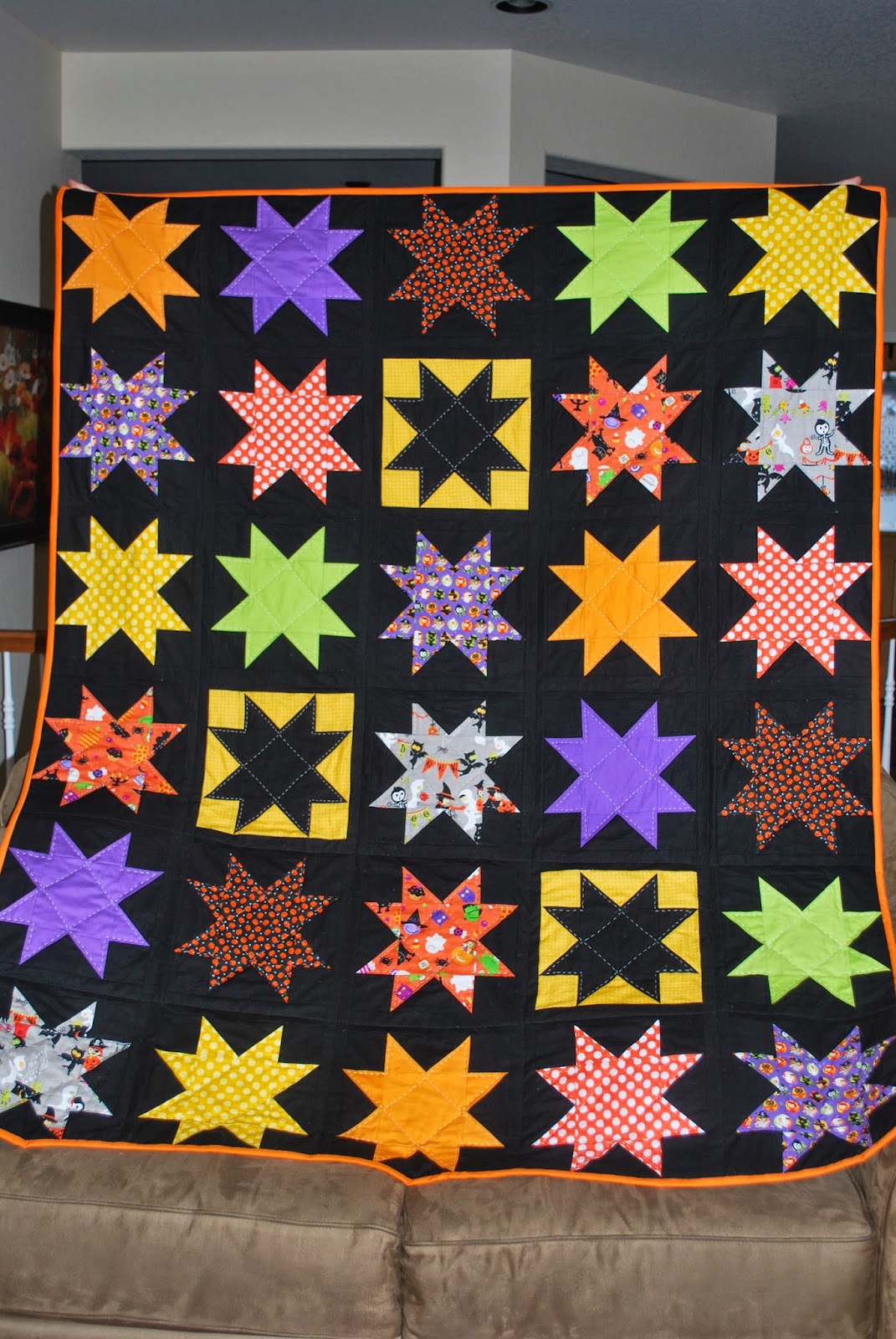 Then I realized it needed more quilting, so I quilted a diamond inside the stars as well as the 1/4" inside the stars. Notice how there are a variety of orange fabrics. (I told you it was one of my favorite colors.) I think all these colors play nicely together, even though they're not all in the same hue. Color play is SO fun! I wanted lots of oranges to remind us it is really a Halloween quilt, then I added some purple, gray and lime green to keep it fresh and modern. The yellows just keep it all balanced and contrasted so nicely with the black. I really loved putting all these fabrics together and watch them turn out as fun as I hoped they would.