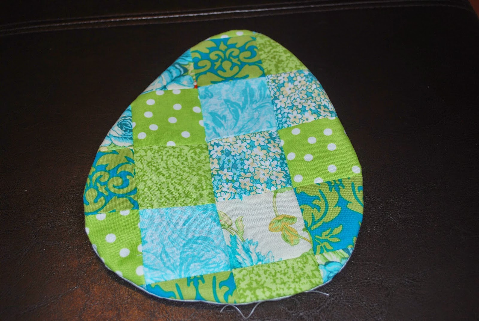 I started by sewing together some 2 1/2 inch squares. Then I made a paper pattern of an egg shape and traced it onto the Pellon fusible interfacing. The dots of the Pellon where the adhesive were I had facing the right side of the fabric. Then I just drew about a 1/4 inch seam around that. I sewed on the line I'd drawn from the pattern and then I cut the second outside line.