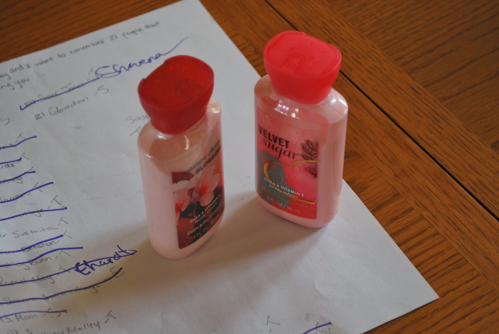 She had her brother help her print out cards saying, "This week is my 21st birthday and I want to remember 21 people that I love, including you . . . " Then there is the heart, and at the bottom, Love, and her name.